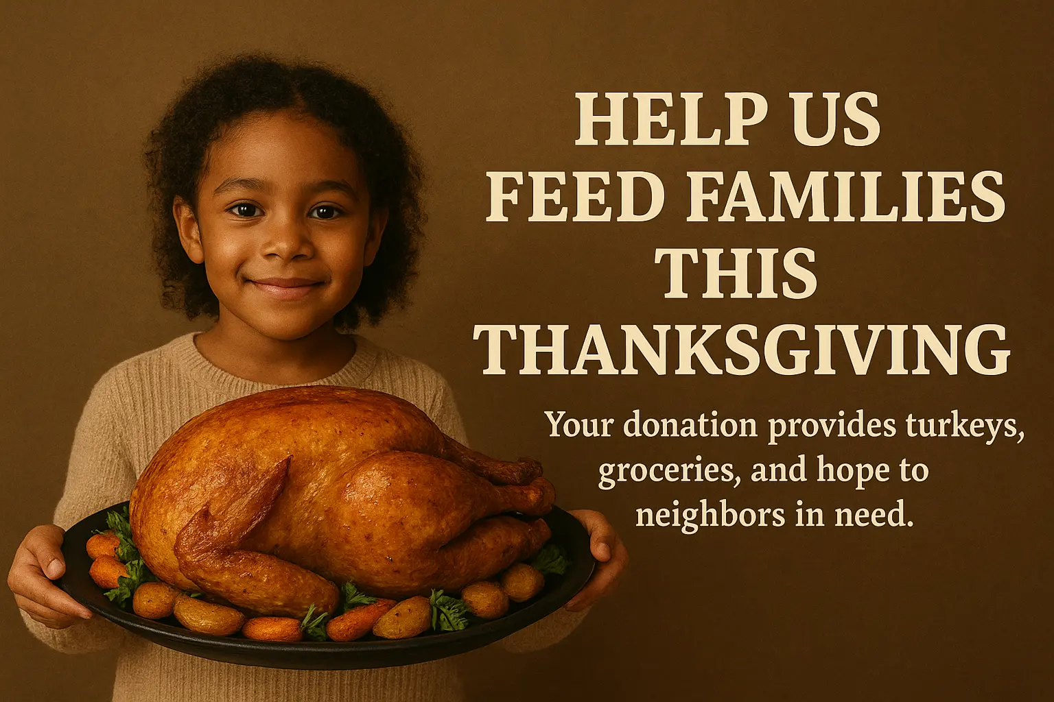 Join us in making a difference this holiday season. Your donation helps us provide warm meals, family support, and a reason to celebrate for those in need. Together, we can ensure that no family in our community goes without a Thanksgiving dinner. Donate now to help us spread hope, joy, and togetherness this holiday season.